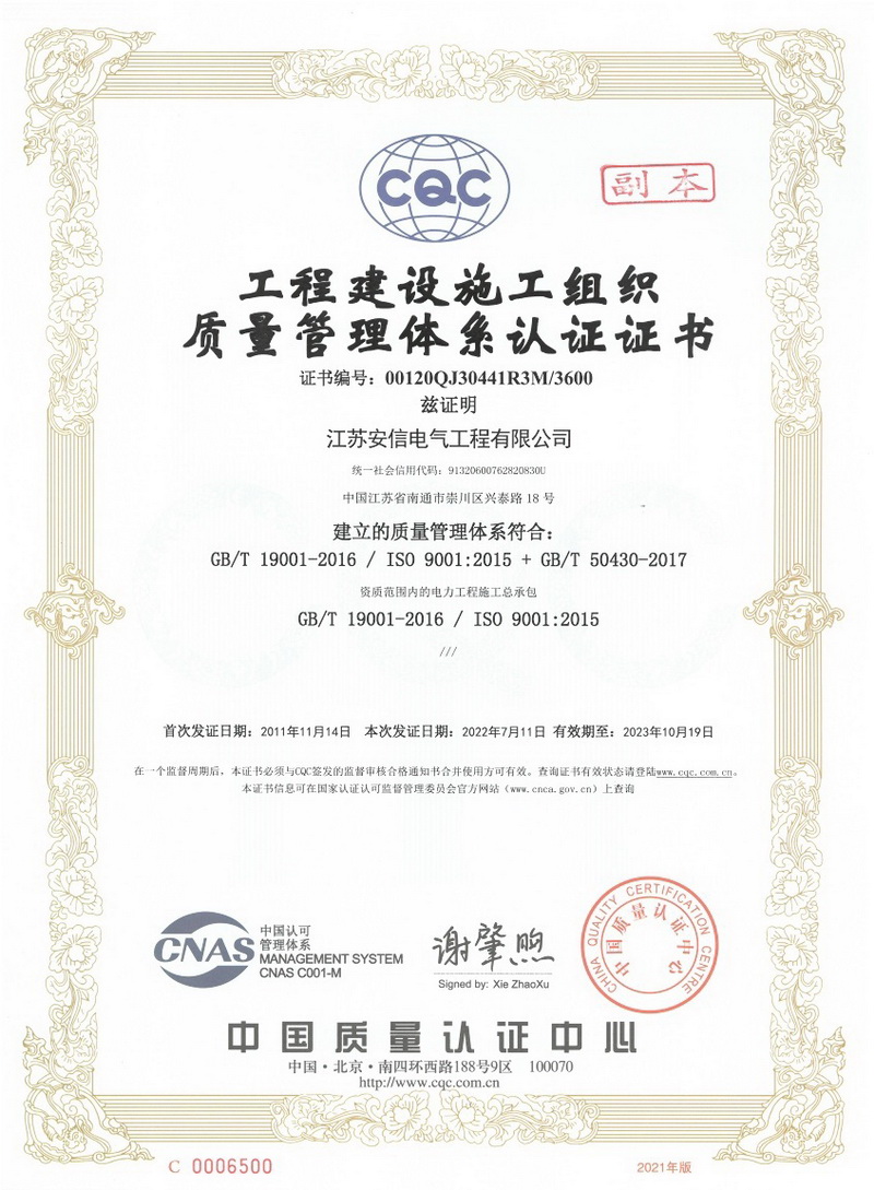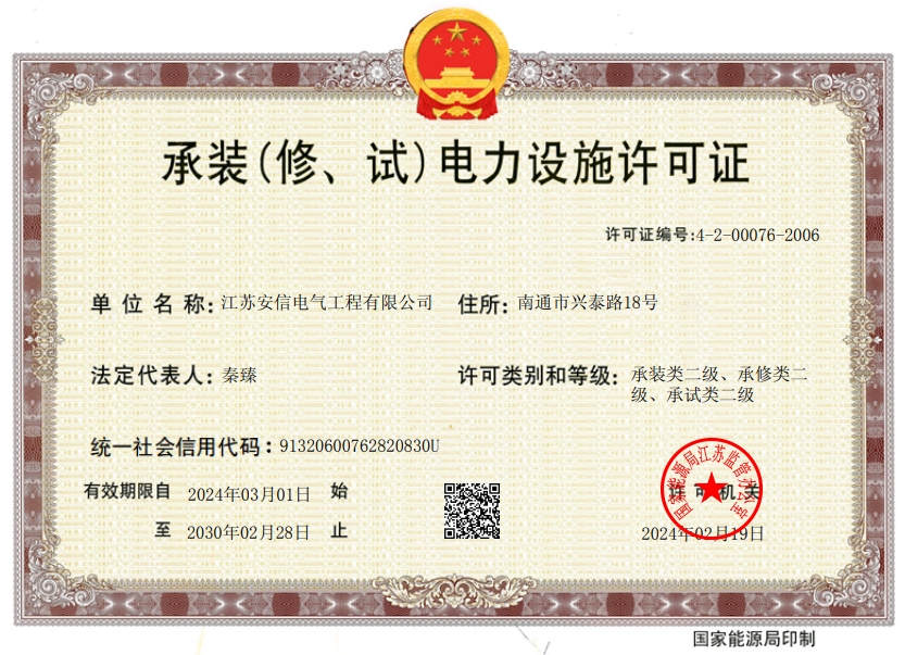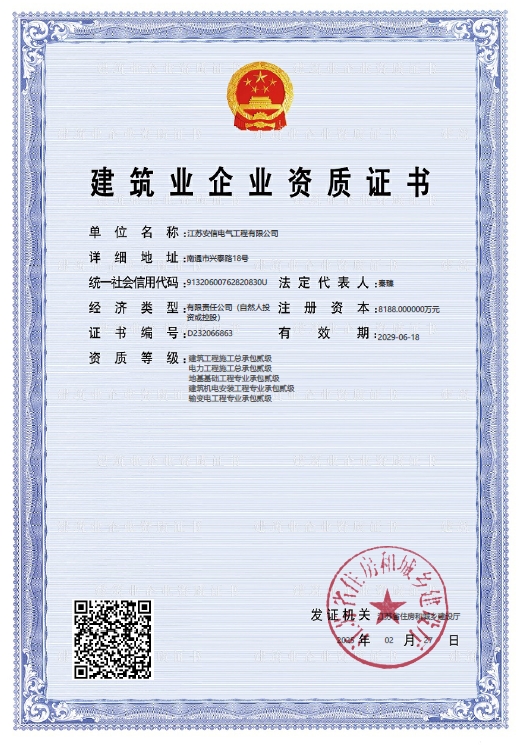 在創(chuàng)業(yè)之初,公司就堅持高起點的戰(zhàn)略思路,廣納賢才,集聚行業(yè)精英,創(chuàng)新發(fā)展,做優(yōu)企業(yè)品牌。現已取得:承裝二級、承修二級、承試二級,電力工程施工總承包二級,輸變電工程專業(yè)承包二級,建筑工程施工總承包二級,建筑機電安裝專業(yè)承包二級,地基基礎專業(yè)承包二級資質證書,并通過了質量、環(huán)境、職業(yè)健康和安全管理體系認證,確保各項工作有序管控。